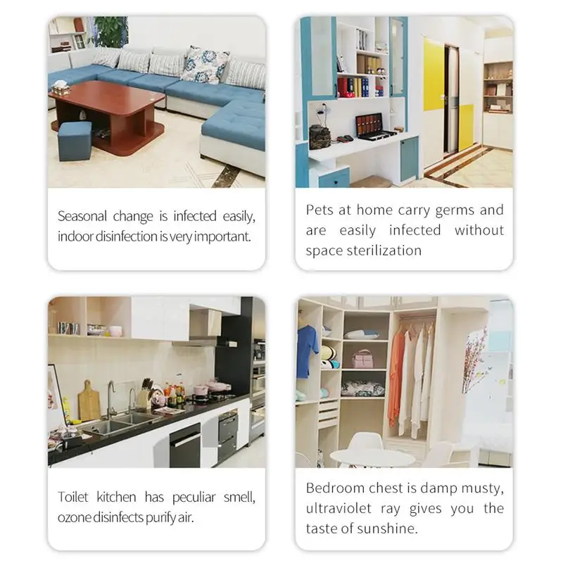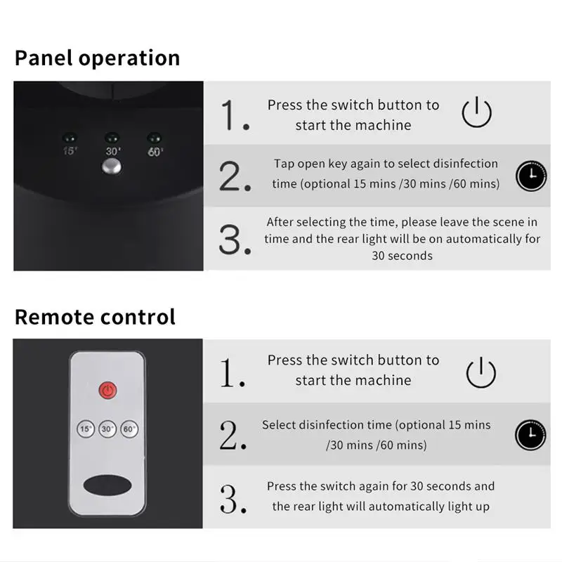 There are 3 levels timing of this lamp: 15 mins/30mins/60mins, you can set the time you want to disinfect your room and create a healthy environment.