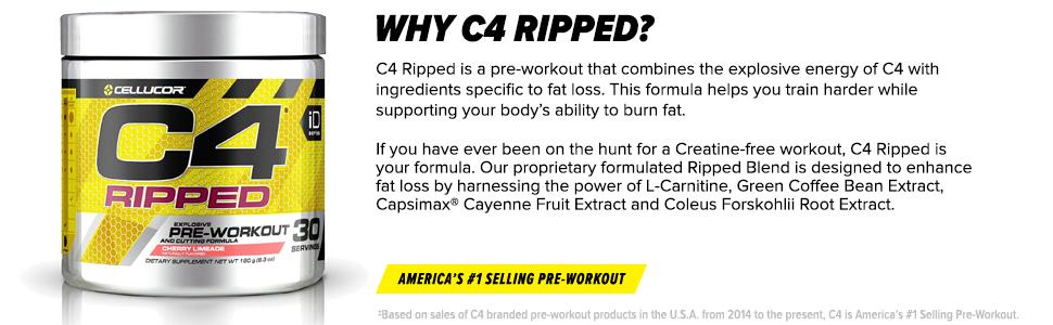 - CUT FAT, NOT MUSCLE: C4 Ripped is a pre-workout supplement that combines the explosive energy of C4 with ingredients specific to fat loss. This formula helps you train harder while supporting your body’s ability to burn fat. Our proprietary formulated Ripped Blend is designed to enhance fat loss by harnessing the power of L-Carnitine, Green Coffee Bean Extract, Capsimax Cayenne Fruit Extract and Coleus Forskohlii Root Extract.
